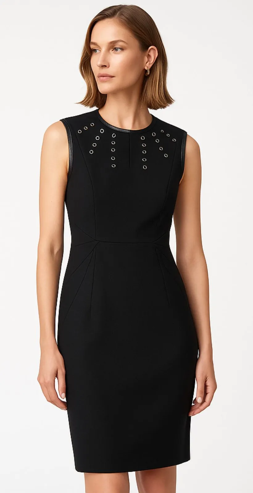 This elegant sheath dress from Classiques Entier features a tailored silhouette with flattering seamwork, grommet embellishments at neckline, and genuine leather trim around the collar & armholes. A subtle front slit at neckline adds a chic designer touch. Made in a substantial weight, double weave fabric with a luxury look and feel. Work, cocktails, or evening events—this dress transitions seamlessly from office to dinner with polished elegance. • Split collar neckline with metal grommet accents • Sleeveless • Leather trim at collar & sleeves • Sheath silhouette w. strategic darts & seaming for a figure-flattering fit • Center back vent. • Concealed back zip with hook-&-eye closure • Fully lined. Small markings at neckline as shown in closeup - haven’t attempted to treat, as a high end dry clean only piece, but superficial enough to remove with professional cleaning and priced to reflect. Size 10 Approx flat measurements: Pit to pit 18.5” Waist 15.5” Hip 19” Length 38.5”