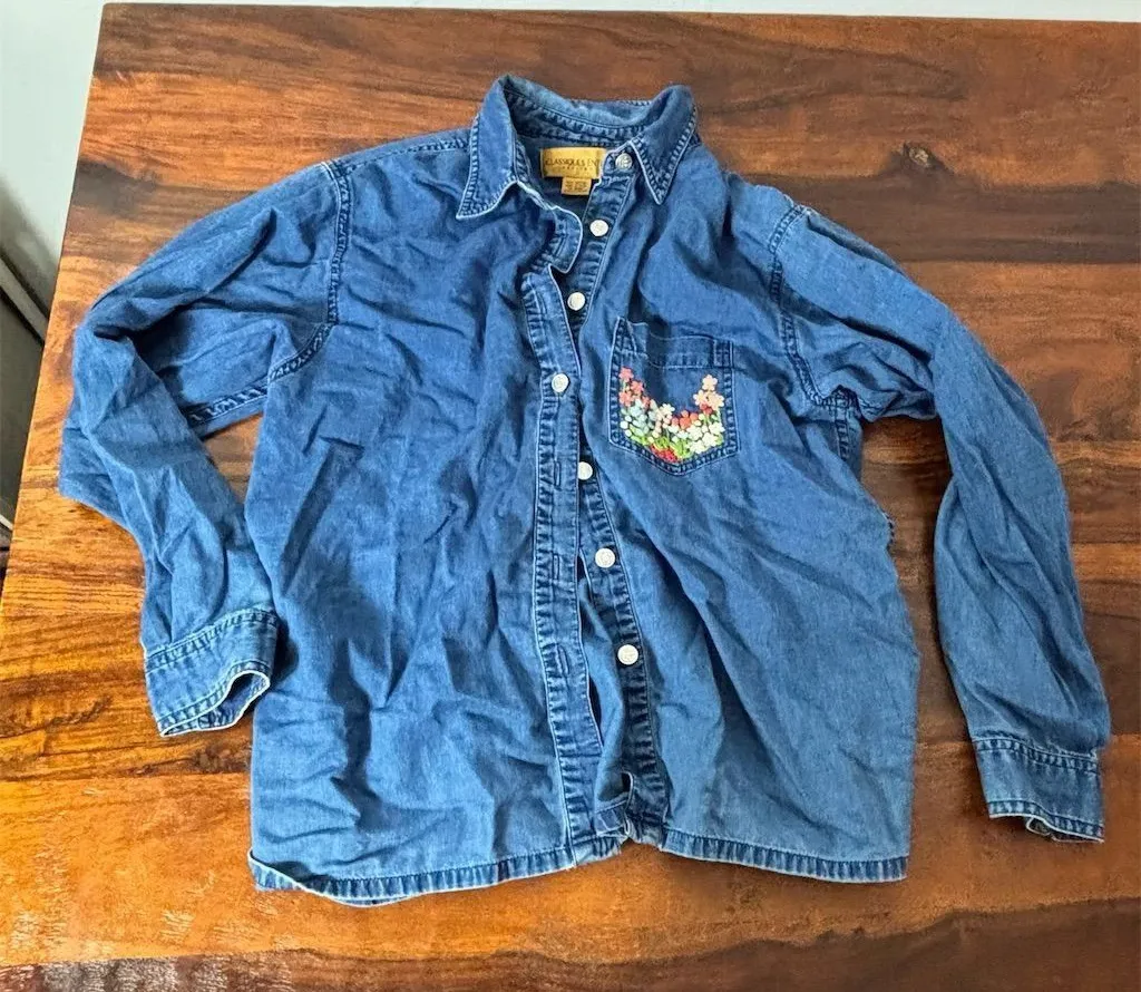 This CLASSIQUES ENTIER button-up shirt is a petite size medium, designed for women. It features a blue floral pattern with embroidered accents, crafted from cotton denim. The long sleeve shirt has a regular fit and a basic style, suitable for casual occasions. Its vintage and cottagecore themes make it ideal for fall outings or relaxed gatherings. The shirt is machine washable and has a button closure. Condition is pre-owned. Keywords: CLASSIQUES ENTIER, button-up, petite, blue, floral, embroidered, denim, vintage, cottagecore, casual, fall, women's, long sleeve, cotton, pre-owned. Brand: CLASSIQUES ENTIER Size: M Color: Blue Type: Button-Up Department: Women Style: Basic Material: Cotton Sleeve length: Long Sleeve Pattern: Floral Accents: Embroidered Theme: Cottagecore, Vintage Fit: Regular Vintage Fabric type: Denim Occasion: Casual Closure: Button Season: Fall Garment care: Machine Washable Smoke free, pet friendly home. May be mailed in recycled materials. See photos for best description.