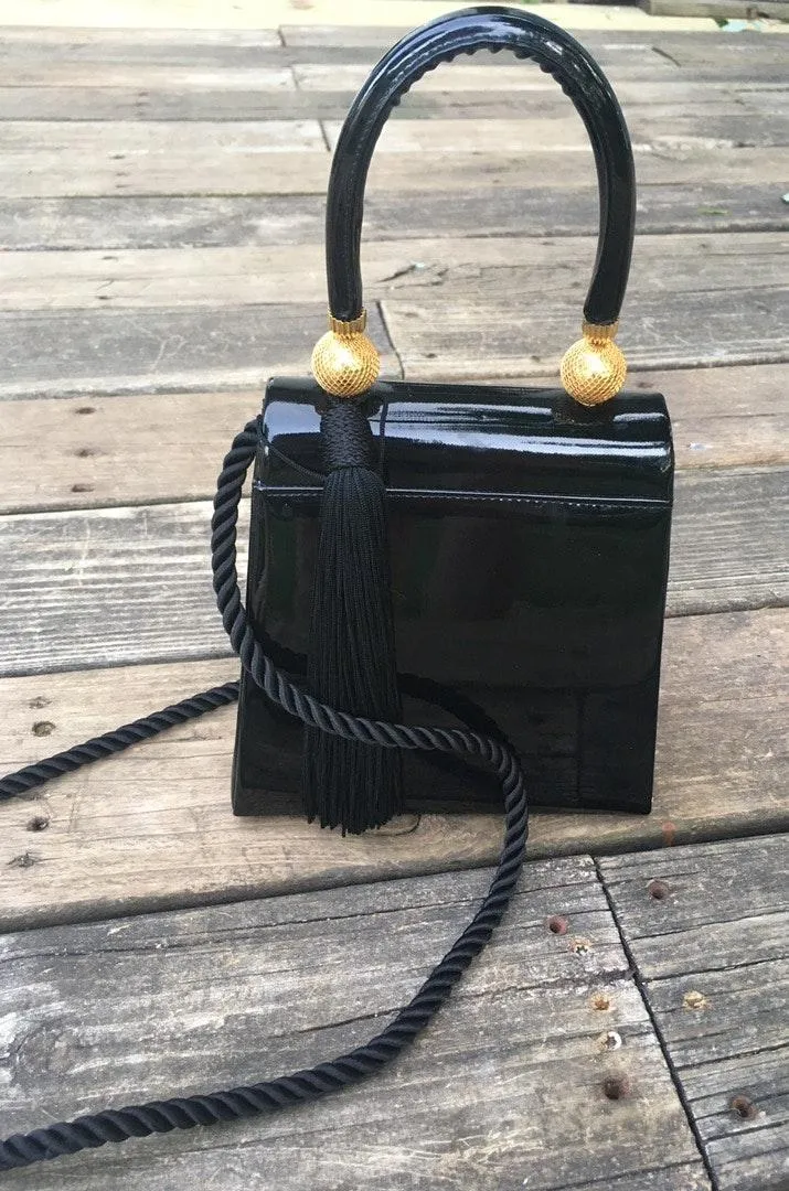 Great condition!!! This bag is classy!!! Just unusual and elegant!!! It’s patent leather I would guess with a gloss making it shine!!! It has a small handle on top connecting two big gold balls with small diamond patterns. Then it has a chunky silky rope shoulder strap separately!! And a big tassel next to the gold balls. It’s 8in length and 7in width!!! The flap is kind of hidden almost the same size of the bag and has a gold button! The inside is plain back with a small pocket inside!!!