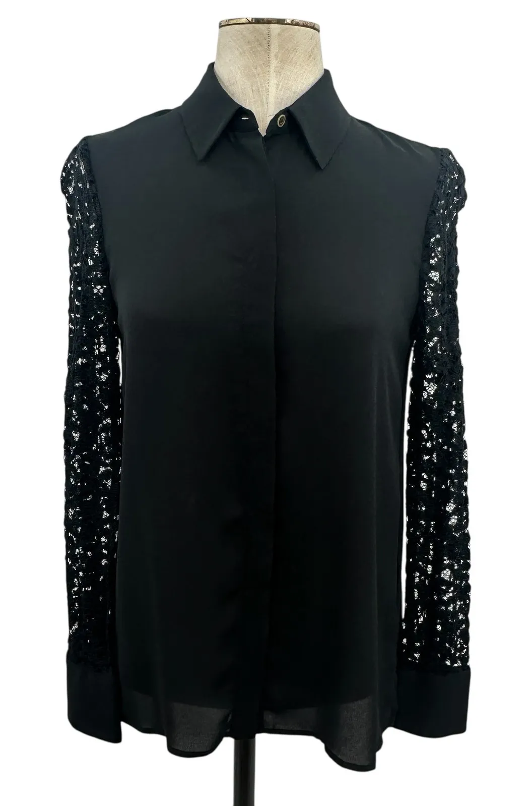 Claudie Pierlot Lace Sleeve Blouse in Black Collared long sleeve semi sheer blouse featuring lace sleeves and hidden button placket. 100% polyester; 50% viscose 50% polyamide Size 36 = US 4