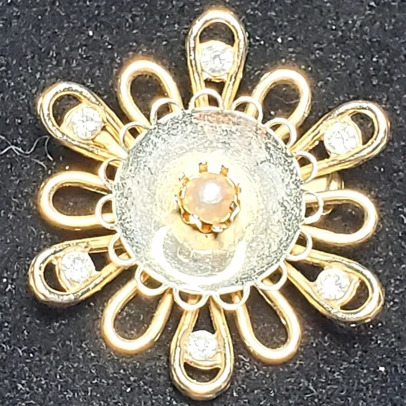 Clear Rhinestone Faux Pearl Gold Tone Vintage Unsigned 1.5" Floral Flower. The brooch was preowned and in good condition. Please view all pictures before purchasing. Item will be packed with care. Message me if you have any questions. Browse and save my store for antique and vintage collectibles. Reasonable offers are considered.