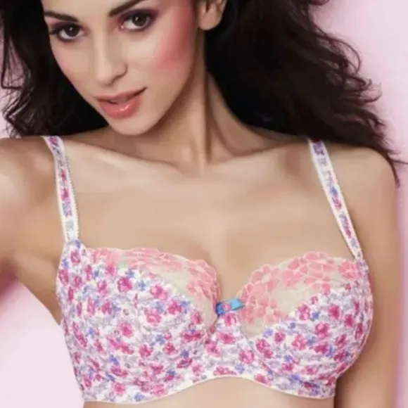 Cleo by Panache Floral Lace Balconnet Bra Size 28J Ivory Cream with pink & blue flowers multicolor boho floral This pretty ditsy floral print 3-part cup underwire bra gives you superior support and takes the "ho hum" out of your lingerie collection. Contrasting floral lace on the top cup panel and satin bow at center front add bright details 3-part underwire cup shapes and supports. Top of cup panel is trimmed with floral lace, matching the satin bow at center front. Center panel is flat and has satin bow. Sides and back have elastic and top and bottom for fit. Sides are seamed, with print near underwire, solid color power mesh on central back. Wide-set front fabric straps adjust in the back with coated metal hardware. Back coated metal hook-and-eye closure.