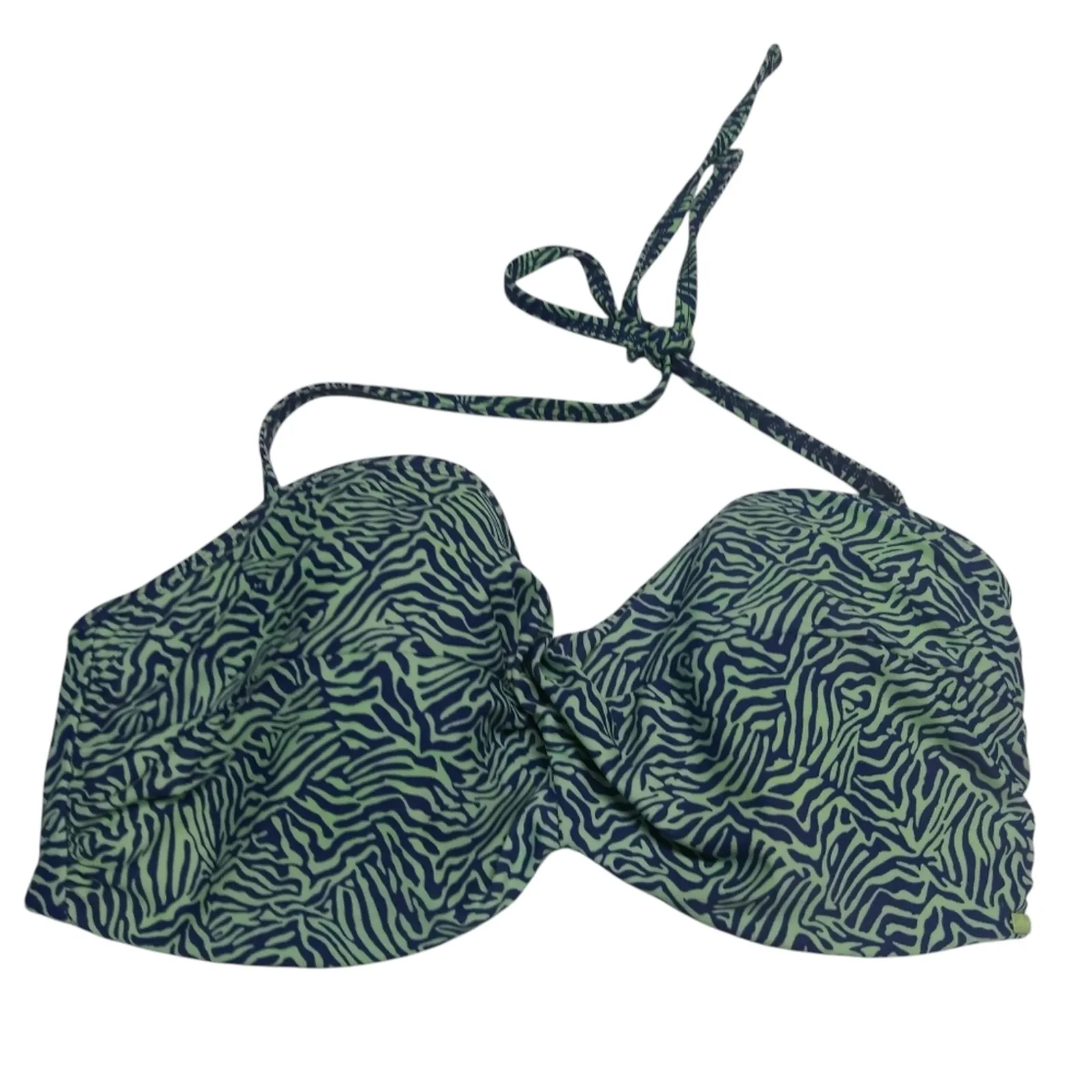 CLEO SWIM by PANACHE HATTIE BANDEAU UNDERWIRE HALTER BIKINI TOP Sz 36DDD/F Stylish bikini top with a green and blue zebra print. 2-part underwire cup has vertical seaming for shape. Lightly padded, stretch cup for modesty. Center panel - twisted fabric on exterior, triangular inside. Sides and back are lined with power mesh and have encased elastic at edges for fit. Seamed sides have boning for added support. Plastic snap open closure. gently worn