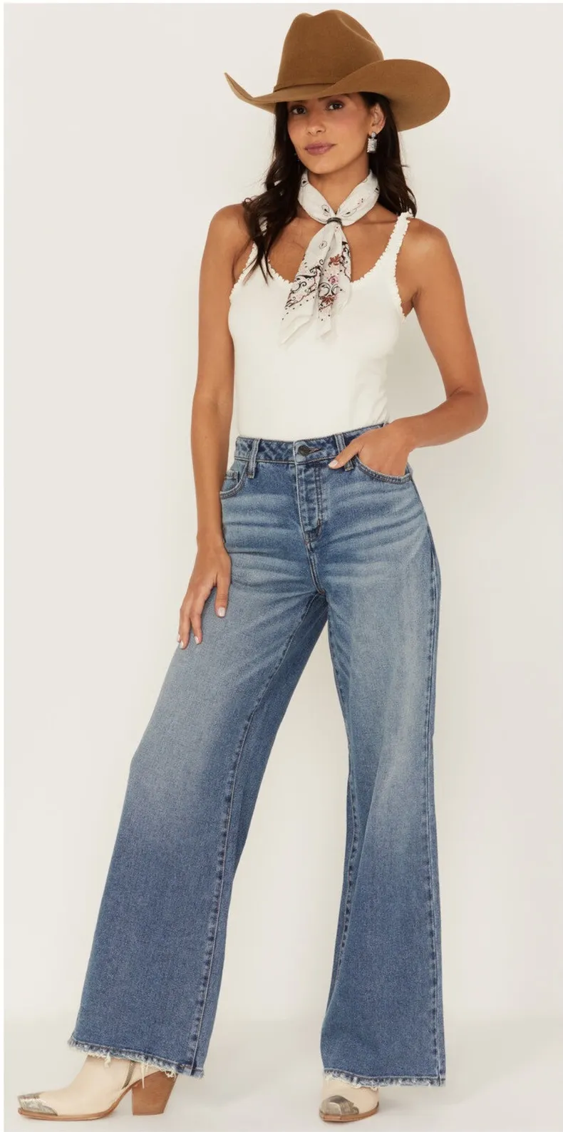 Tough enough for the rodeo and stylish enough for the town, the Cleo + Wolf Women's Medium Wash High Rise Loose Distressed Jeans are made for the modern cowgirl Gently used in excellent condition Waist 16" Rise 14" Inseam 33" Keywords: Cleo + Wolf jeans, high rise jeans, flare leg jeans, loose fit jeans, distressed hem jeans, women's jeans, denim jeans, casual jeans, size 28W x 32L, blue jeans, bootcut jeans, vintage style jeans, comfortable jeans, stylish jeans, fashion jeans
