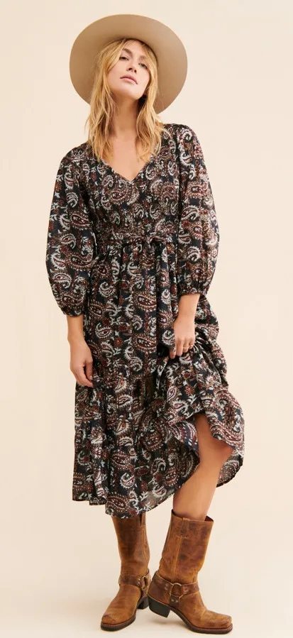 Black with multicolored paisley printed midi dress in tiered silhouette w/ smocking at the top. Made... Show more