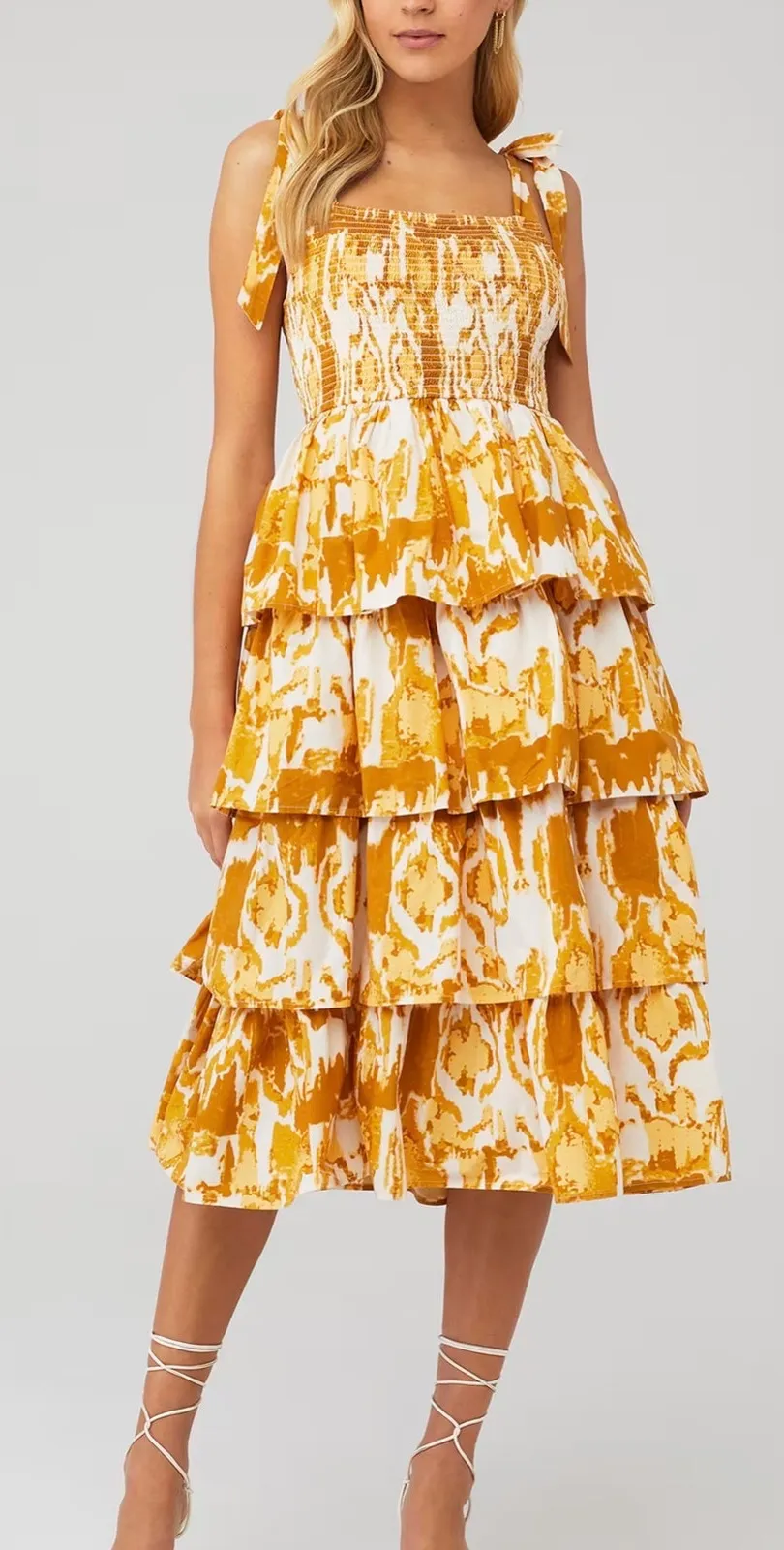 size Large Cleobella Shae Ruffle Tiered Midi Dress in a yellow and white watercolor ikat print. Smocked bodice Adjustable tie straps Tiered skirt Midi length 100% cotton Measurements approximate laying flat 18" bust, 39" length Romantic, Girly, Cottage, Eclectic, boho, Indie, Valentines, Date Night, coastal, beach, travel, tropical, Eclectic, bachelorette, club, night out, special occasion, holiday, derby, concert, minimalist, vacation, travel, cruise, girls trip, resort, chic, birthday, event, winery, wine tasting, honeymoon, retro, vintage, pretty, feminine, engagement, Euro Summer, Picnic, Mediterranean, Neutrals, Club ready, Scandi, Euro, Polished, Rodeo, Maximalism, Botanical, Garden, Timeless, Ranch