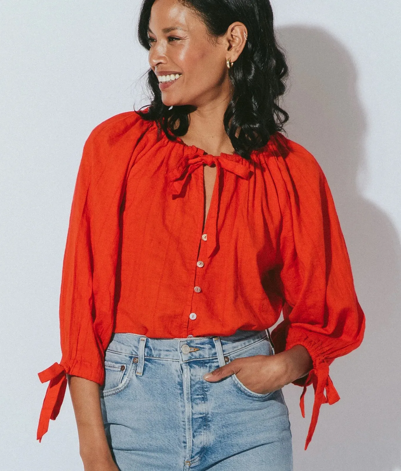 Womens Size Small Bright Red/Orange color. Drawstring neckline 3/4 Sleeve with Elastic cuffs with tie detail Shell button front detail Unlined *Measurements taken laying flat and are approximate: Pit to pit: 21” Shoulder to hem: 24” Shoulder to cuff: 20” Excellent condition, no stains or holes. 100% Organic Cotton Peasant, Boho, Bohemian, Ethical, Lightweight, Summer, Spring, Travel, Vacation, Cruise, Resort, Colorful, Bright,