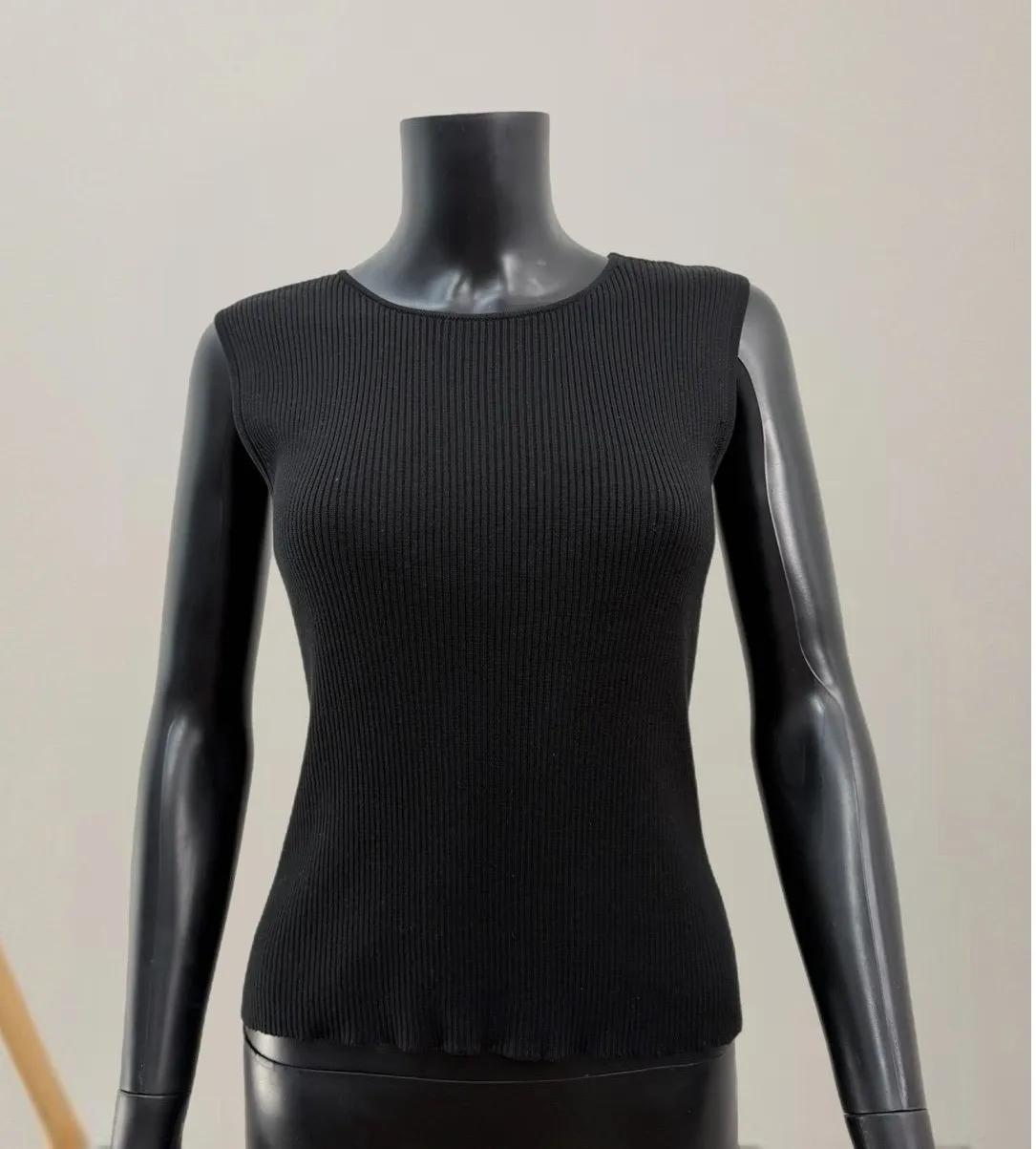 Classic and elegant CLIO sleeveless ribbed tank top in a premium silk-cotton blend. Features a soft, stretchy rib knit, crew neckline, and a flattering fitted silhouette—perfect for layering or wearing alone. Size: L Material: 75% Silk / 25% Cotton Color: Black Condition: Excellent pre-owned condition, no flaws noted. Measurements (approx.): • Pit to pit: 17" • Length: 24.5" Smoke-free, pet-free home. Ready to ship! ⸻ #SilkTop #MinimalistStyle #BlackTankTop #RibbedTop #ClassicEssentials C/2
