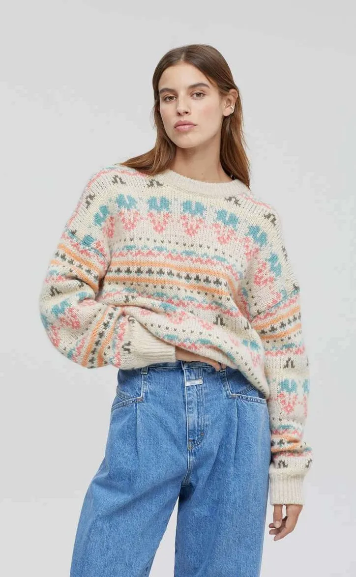 A cream-colored knit sweater from CLOSED featuring a charming multicolor Fair Isle pattern with stra... Show more
