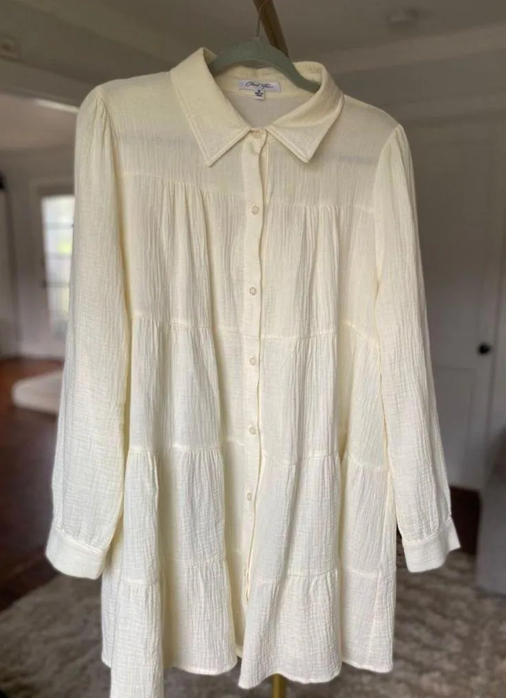 Size: M Please note: The first image in this listing is an AI-generated representation of a similar style to illustrate fit and aesthetic. The actual item available for purchase is shown beginning with the second photo in the listing. Description: This Cloud Ten 100% cotton mini-length button down cover up is breezy, lightweight, and perfect for layering over swimwear. Its flowy silhouette and textured cream fabric make it a versatile resort essential for the beach or poolside. Style Profile: resortwear, beach cover up, minimalist chic, luxury coastal style, vacation ready, Hawaii vibes, cream cotton, breathable cotton, mini length cover up, poolside chic, beachwear, tropical essential, spa resort look, chic casual, lightweight layering, warm weather essential, relaxed luxe, Instagram worthy, high fashion inspired, contemporary coastal, neutral core, bougie aesthetic, elegant casual, effortless chic, resort staple, feminine resortwear, luxury travel fashion, timeless beach style, boutique coastal look, minimalist resort style Color Season: Light Summer 2538