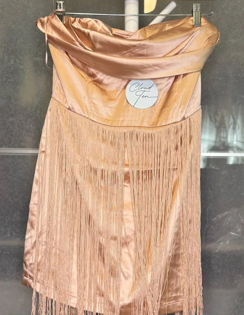 Elevate your style with the Cloud Gem Strapless Fringe Dress. This stunning gold dress features a chic strapless design and elegant fringe detailing, perfect for any special occasion.