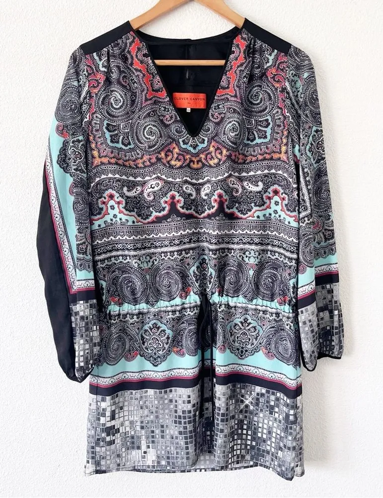 size XS. V Bold, artsy, and unmistakably chic, this Clover Canyon paisley mini dress features a vibrant multicolor print with a flattering long-sleeve silhouette. Known for statement designs and standout patterns, Clover Canyon delivers a modern mini that’s perfect for day-to-night styling, casual events, or creative wardrobes. 🖤 Details to love: • Authentic Clover Canyon designer dress • Eye-catching paisley / abstract print • Flattering V-neckline • Long sleeves with comfortable fit • Adjustable drawstring waist • Mini length with easy movement • Unlined, lightweight feel 📏 Size XS – Measurements (approx.): • Length (shoulder to hem): 33” • Pit to pit: 19” • Sleeve length: 23” • Waist across: 18” ✨ Condition: Excellent pre-owned condition, no flaws noted Smoke-free home. Style with ankle boots, heels, or sneakers—perfect for lovers of statement dresses, modern boho, festival style, and artistic fashion.