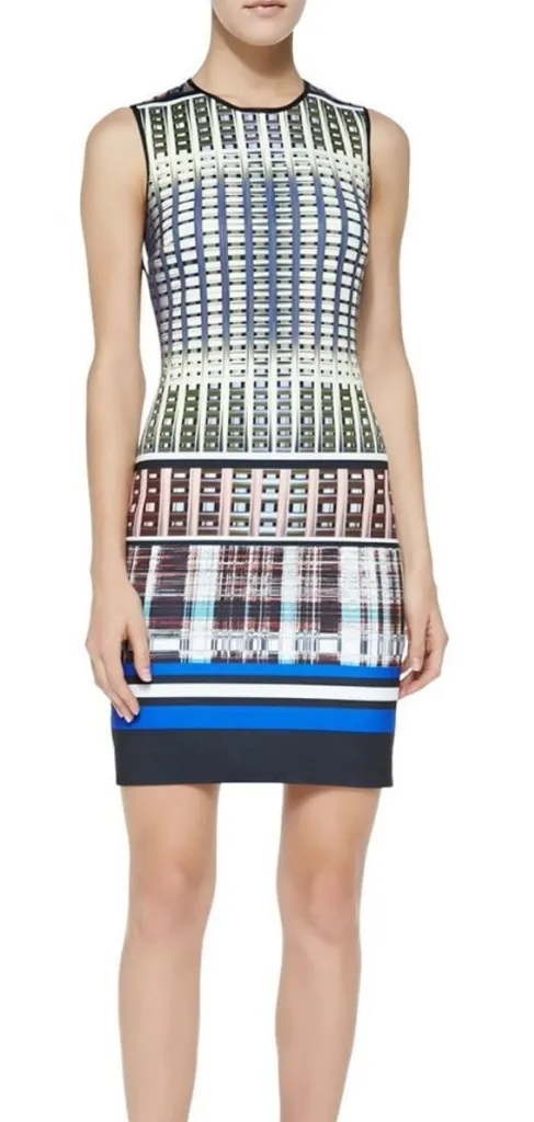 Clover Canyon Donegal dress in mixed-print jersey. Round neckline. Sleeveless; wide shoulder coverage. Slim, formfitting silhouette. Slips on over head. Back zip. Polyester/spandex. Neoprene. Stretchy. As seen on Debby Ryan as Jessy Prescot on Jessie. Size M Measurements: Chest: 16.5 Waist:14 Length: 35