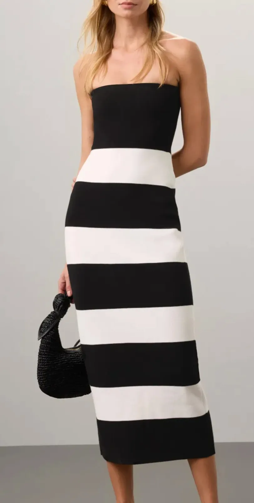 Sexy strapless bodycon dress with flattering thick ribbed knit stretch fabric to hug those curves in a wide stripe. Perfect for date night, brunch, casual evening, movies wedding shower, resortwear, pool party, barbecue, cruise, vacation, resort. Black and white striped (58% Viscose, 24% Polyester, 15% Nylon, 3% Elastane) Machine wah delicate Unlined Pull-on styling Size Small Armpit to Armpit ~18" Stretch ribbed knit Please Note: there is two small dark spots on the back right side - see last photo - reflected in the price =- otherwise Excellent condition Retail $300