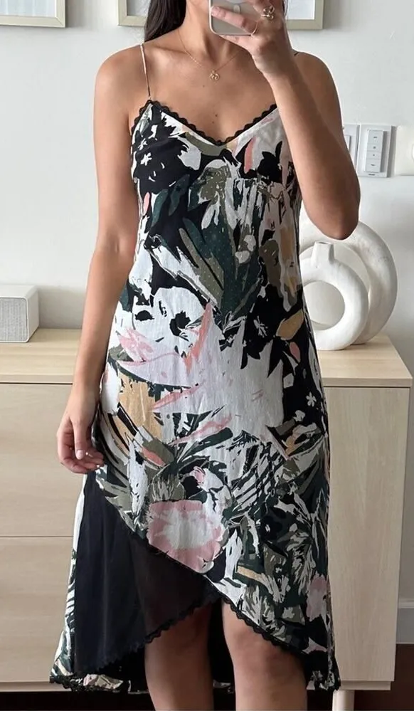 Club Monaco Kittrick floral print 100% silk midi dress A high-low hem and tonal swiss dot reinvent a '90s slip dress. Sweetheart neckline, lace trim. Concealed back zip with hook-and-eye closure Gorgeous print of black, white, pinks, greens and yellow. 100% silk outer polyester lining. Excellent preloved Size 00 - but runs a bit large Armpit to armpit 16'' Tropical leaf lace summer brunch date flowy relaxed fit asymmetrical asymmetric