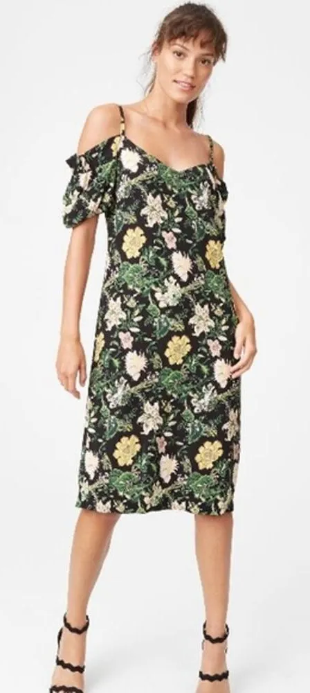 It's romantic, feminine, and easy-to-wear! Features sophisticated dark florals, a relaxed-fit sheath silhouette, and sexy cold shoulders. These cut-outs and the V-neck balance with a midi length for a chic party look. 100% viscose Straight fit, cold-shoulder V-neck; shoulder straps Short sleeves, elasticated top & cuffs Concealed back zip, hook & eye closure Size 2 Measurements~~ 17.5" Pit to pit 45" Length Excellent condition, no flaws