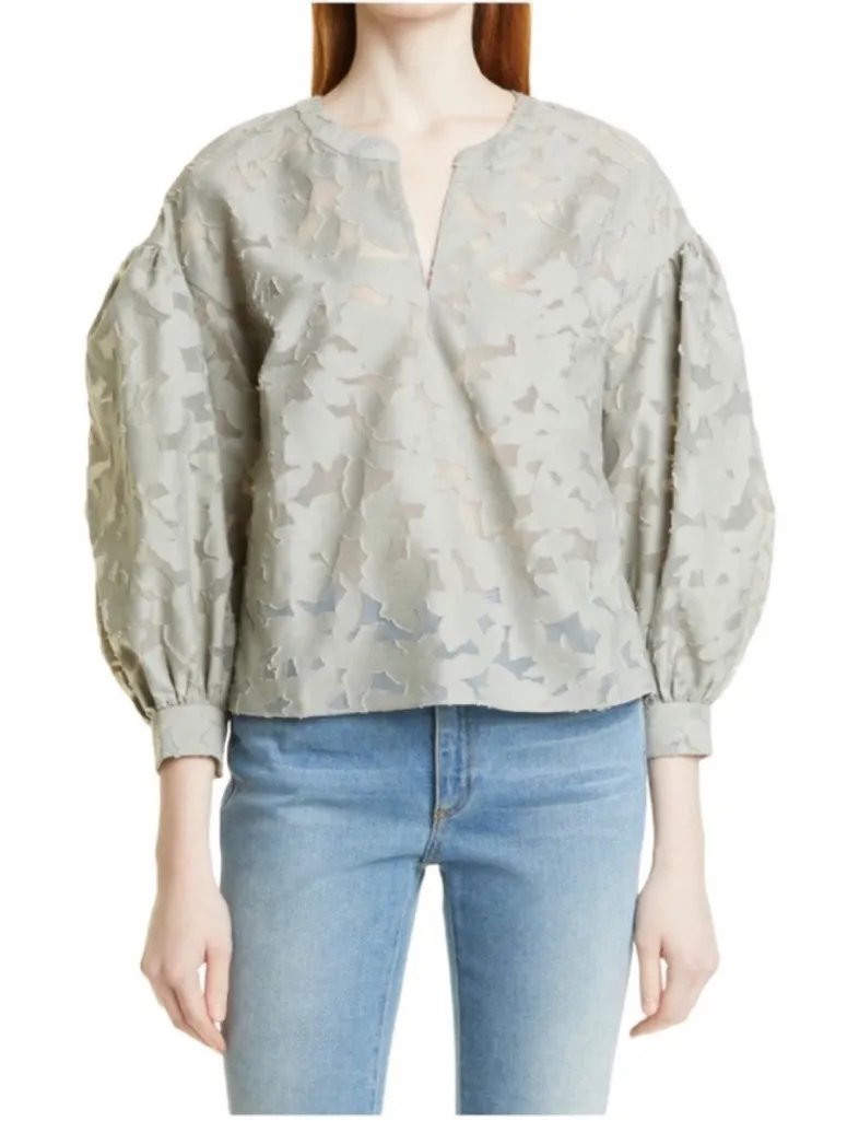 Gently used Size small Measurements in photos Artisanal aesthetic. This boxy top has endless wow factor and pairing possibilities. Between the luxe floral fil coupé fabric and sculptural blouson sleeves, it feels like wearable art. Designed for a roomy fit through the body and sleeves. Think comfortable luxury. Color palette inspired by notable textiles, modern art, and interior design of the early to mid-20th century 59% cotton; 41% nylon Relaxed fit with a 23½" length; based on a size M Pullover style Split neck; dropped shoulders; three-quarter-length blouson sleeves; single-button barrel cuffs; back shoulder yoke We appreciate you checking out The Vintage Fern!
