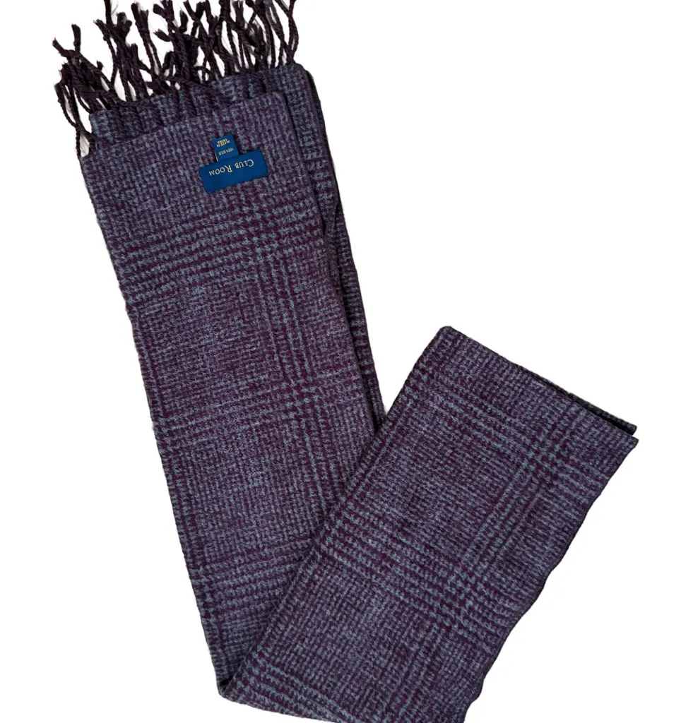 This Club Room scarf in a rich purple hue features a subtle plaid pattern, adding texture and elegance to your ensemble. Crafted from a wool-blend fabric, it offers warmth and style, while the fringe detail at the end provides a decorative touch.