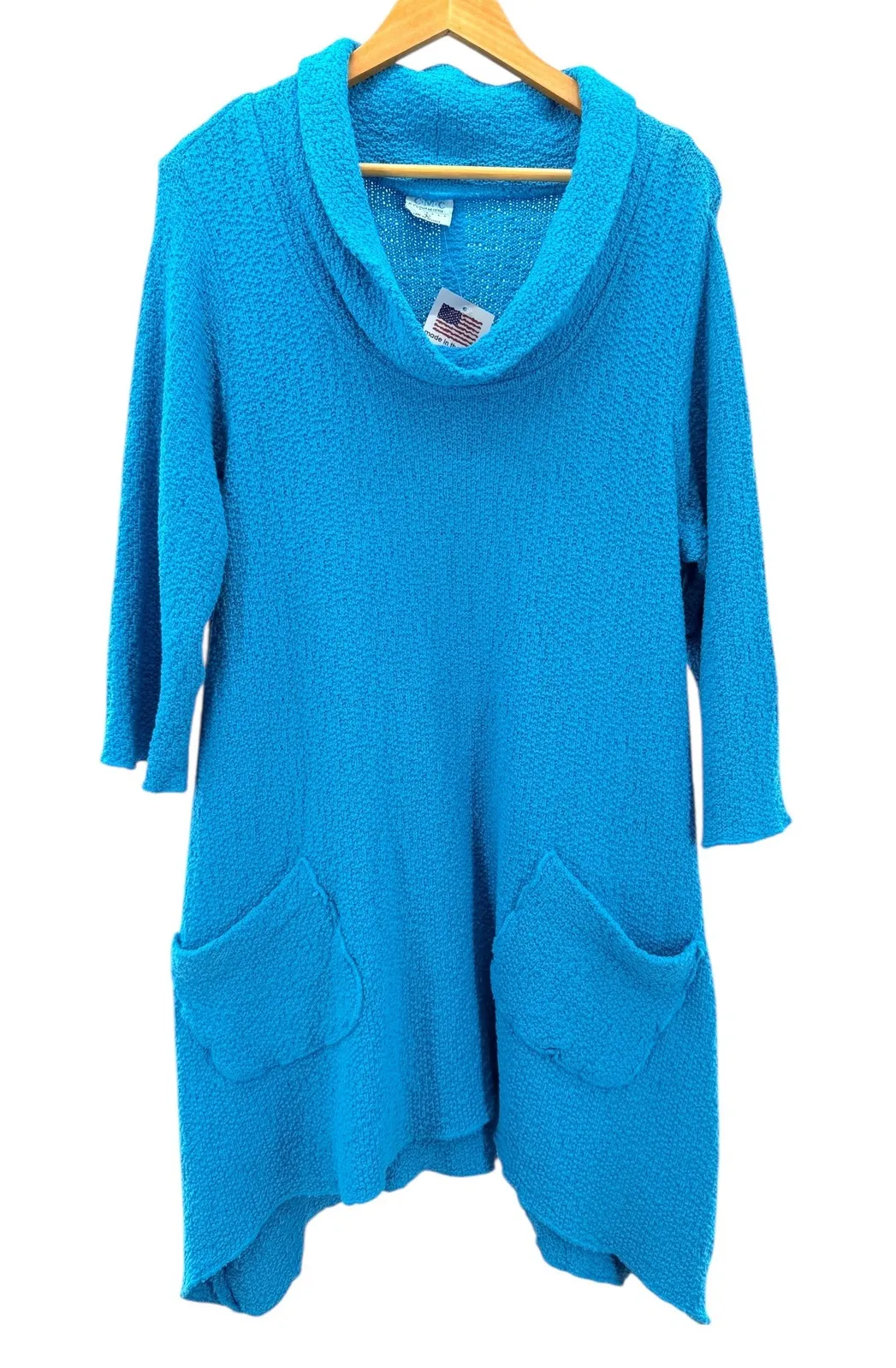 Effortlessly cozy and beautifully made, this CMC knit tunic dress features a relaxed lagenlook silhouette with a soft draped cowl neckline and roomy patch pockets. Crafted in the USA from breathable cotton knit, this piece is perfect for layering or wearing solo for an easy, artsy everyday look. The textured knit and relaxed drape make it ideal for comfort lovers, creative wardrobes, and anyone who loves a timeless, slow-fashion aesthetic. Details: Brand: CMC Size: Large Color: Bright turquoise / aqua Fabric: 100% cotton Made in USA Cowl neckline Long sleeves Front patch pockets Relaxed, flowy fit Lightweight textured knit Lagenlook / art-to-wear style Measurements (approx): Pit to pit: 23" Length: 41" Sleeve: 21" Condition: New With Tags Perfect for layering, travel, cozy days, or artful minimalist wardrobes. Keywords: textured knit, cowl neck, asymmetrical, tunic, patch pockets, made in usa, casual dress, comfortable, boho, art to wear, cotton blend, everyday wear, unique knit