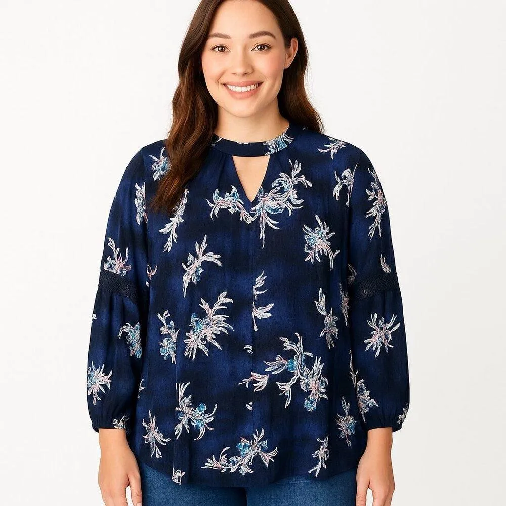 Description: Effortlessly boho-chic, this Lane Bryant navy blouse features a keyhole neckline, breez... Show more