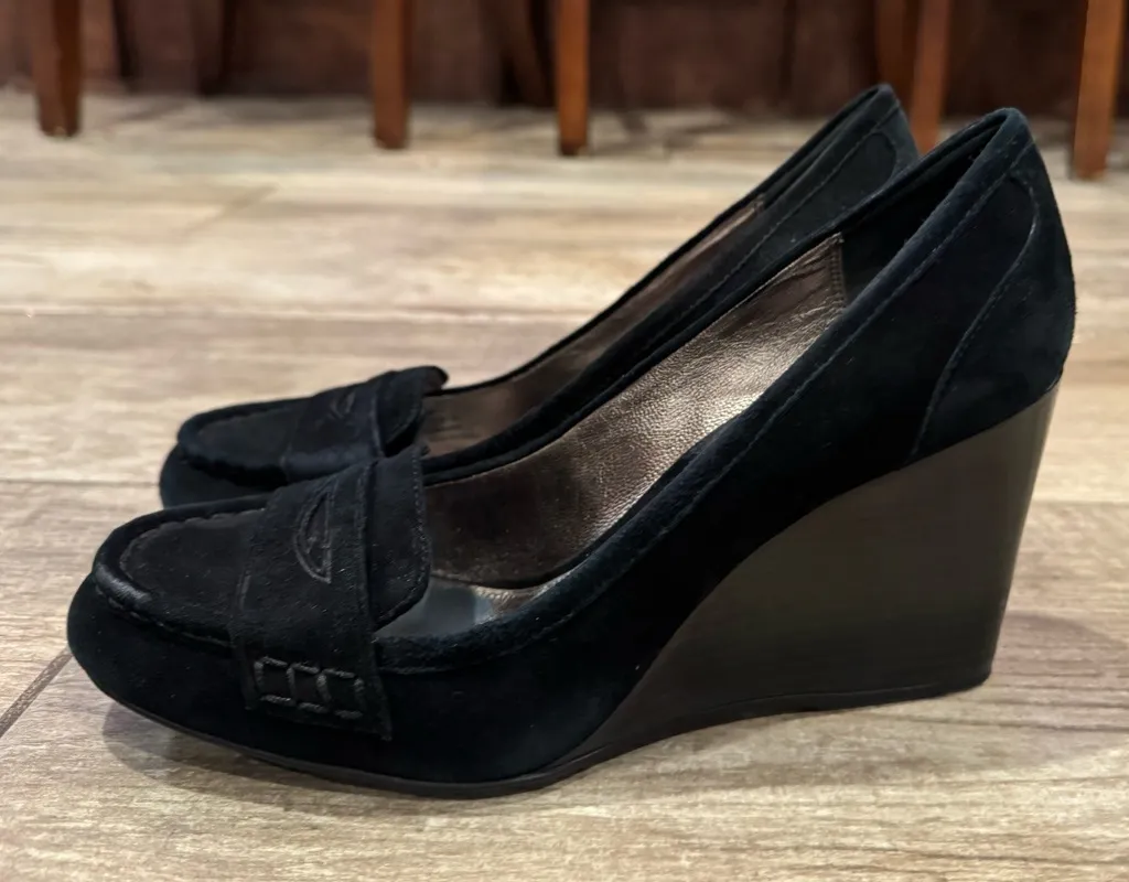 Coach black suede wedge heels — classic Coach society silhouette with sleek suede upper and comforta... Show more