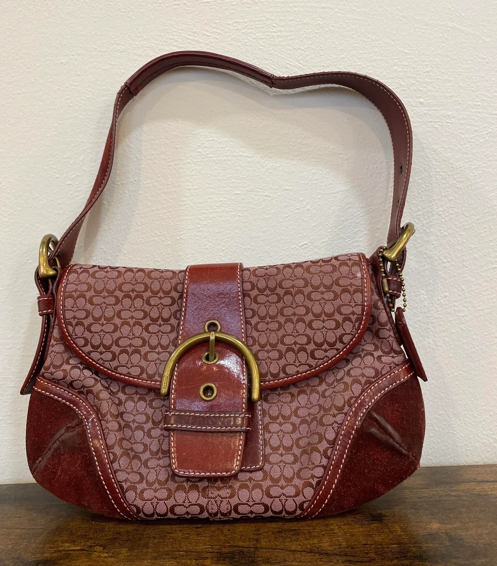 Gently used burgundy Coach purse. Gold Buckley detail. Some wear but in good condition.