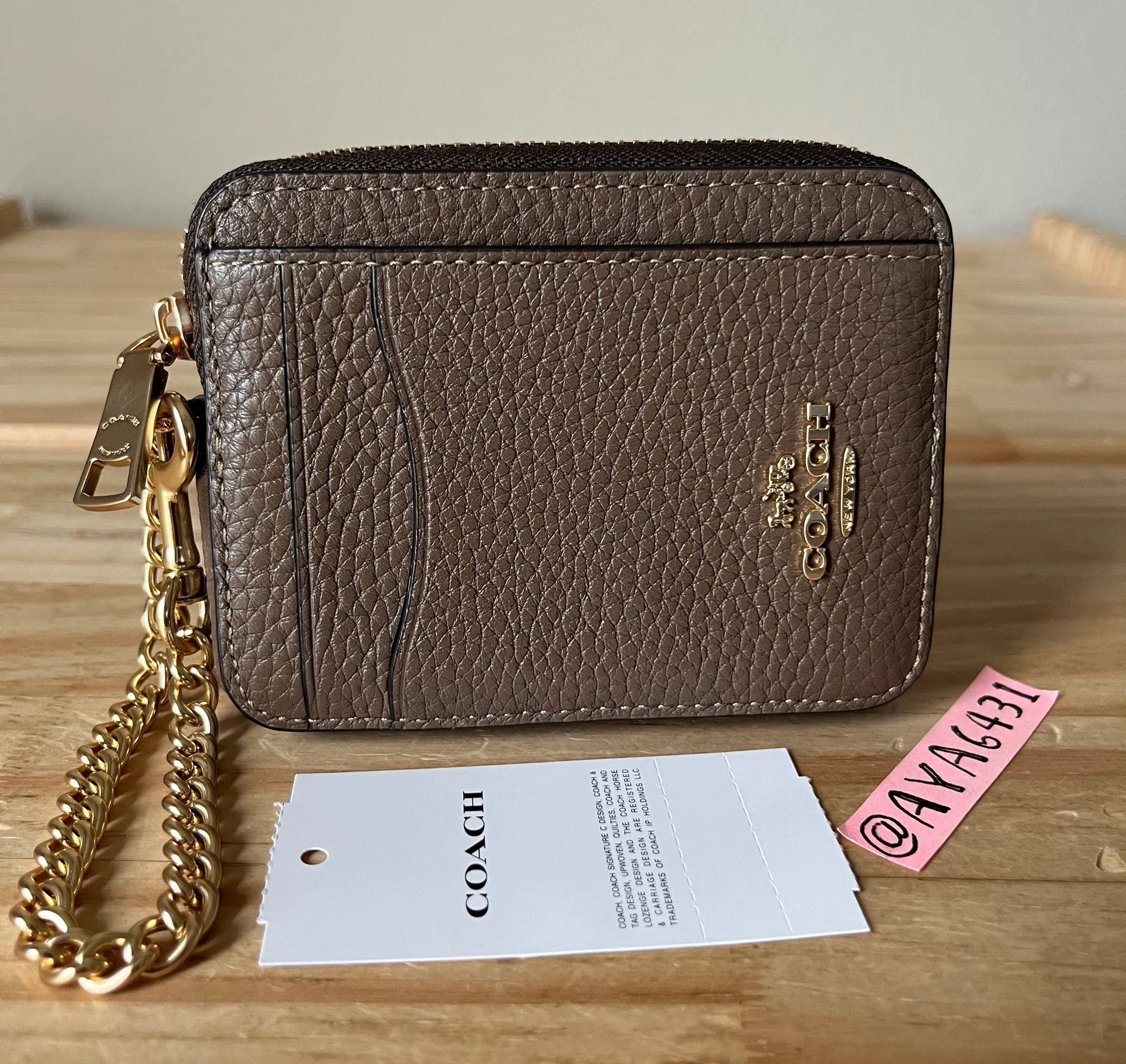 100% authentic Brand new with tags 6303 zip card case Dark stone and gold hardware 4 1/8” L x 3 1... Show more