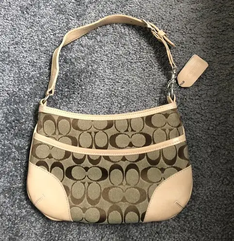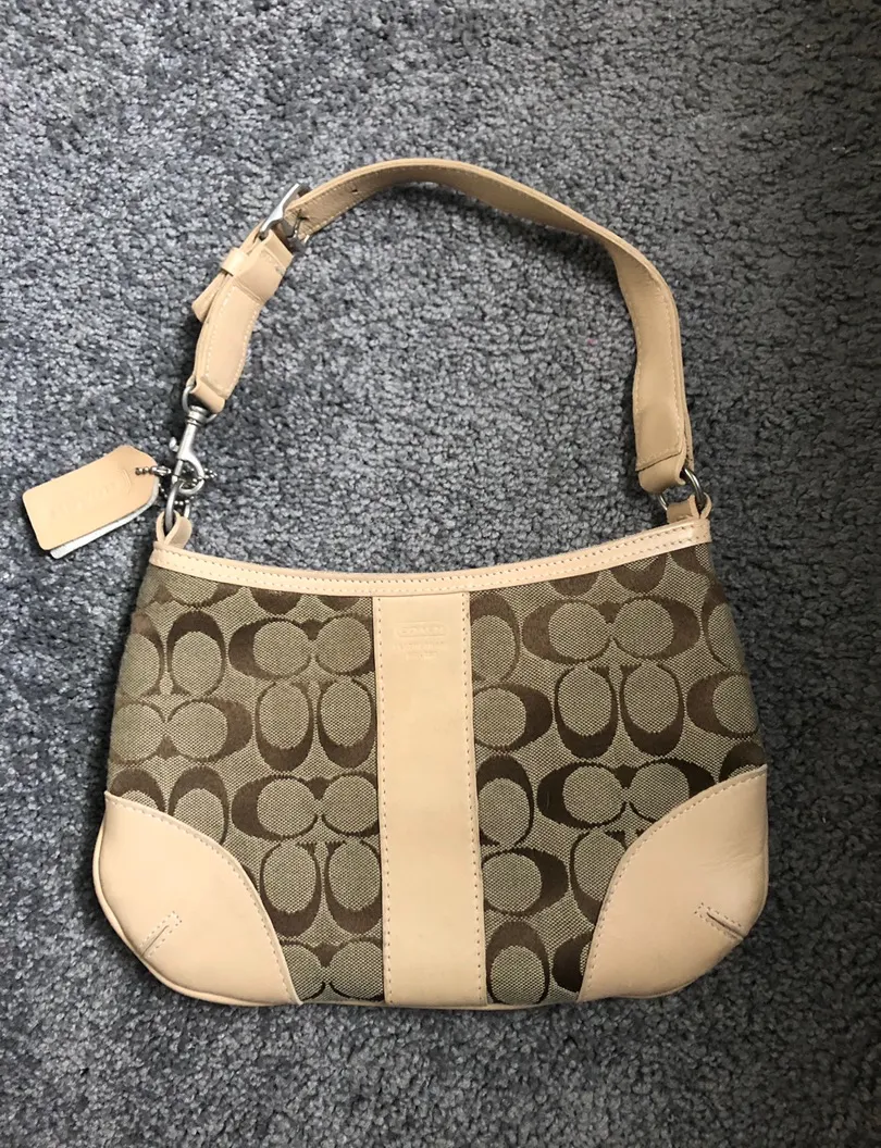 Vintage beige Coach handbag. Zipper closure and adjustable shoulder strap. Additional zipper pocket... Show more