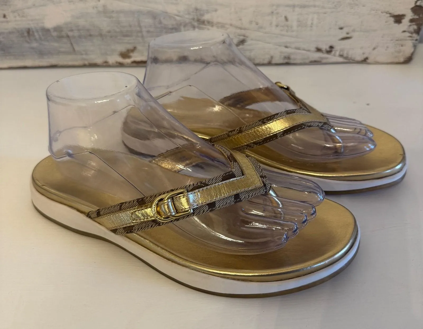 Brand: Coach Model: Lyndsey womens thong sandals with logo buckle detail. Color: Metallic gold foo... Show more