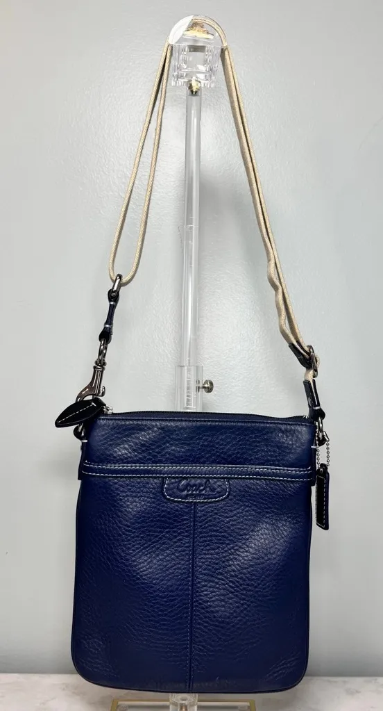 Coach Penelope Legacy Swing Pack crossbody bag in navy blue pebbled leather with contrasting white s... Show more