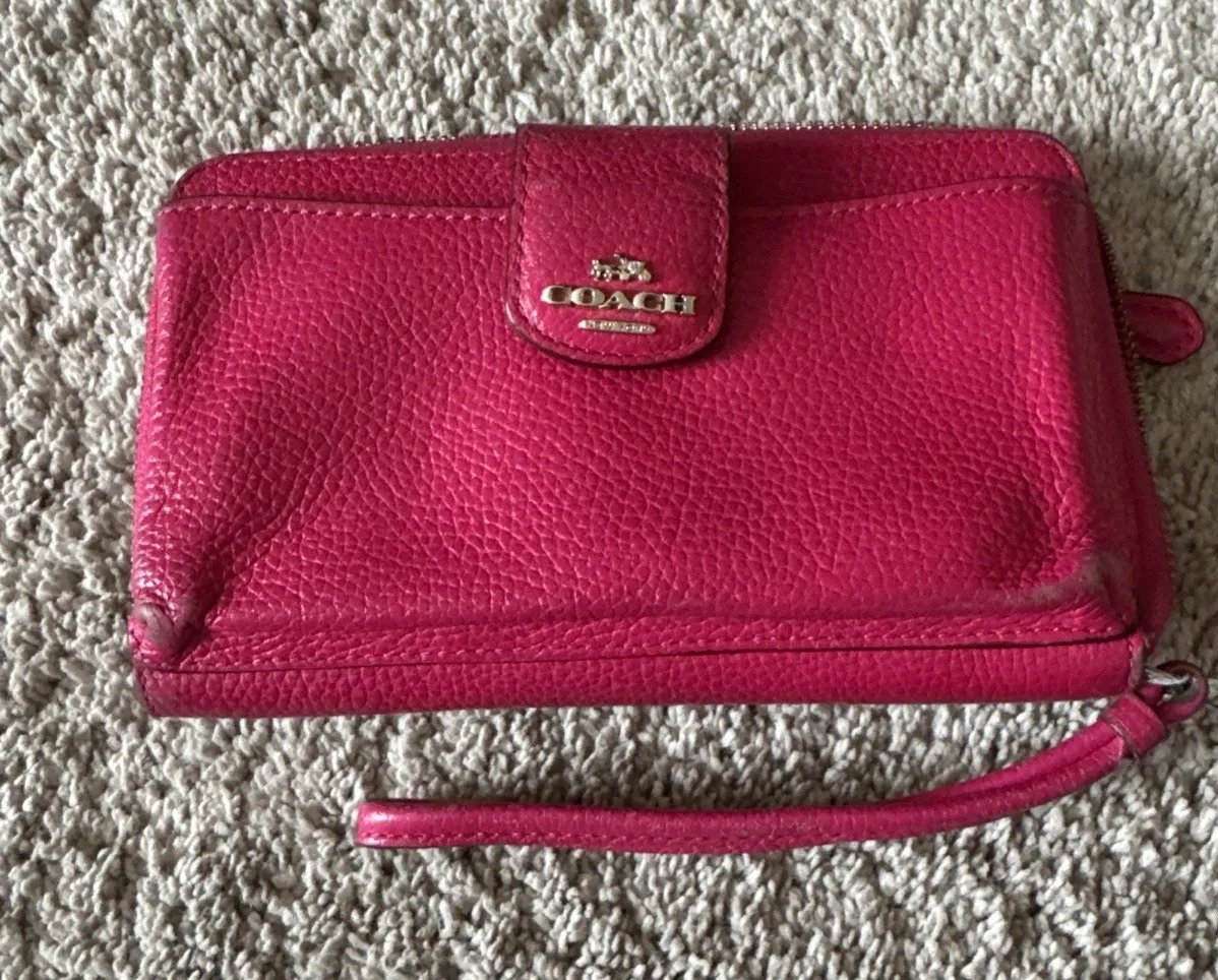 Keywords: Coach wristlet, pink wallet, leather clutch, zip around organizer, continental wallet, women's accessory, designer wallet, fashion wristlet, travel organizer, everyday carry, pebbled leather, signature style, gift for her, on the go, chic accessory