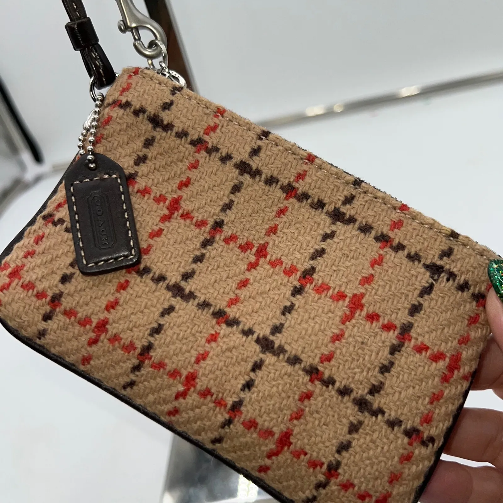 Capture timeless charm with this delightful Coach wristlet pouch. Its cozy tweed fabric, woven with... Show more