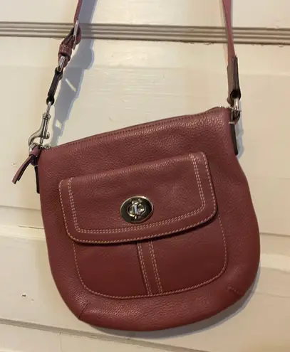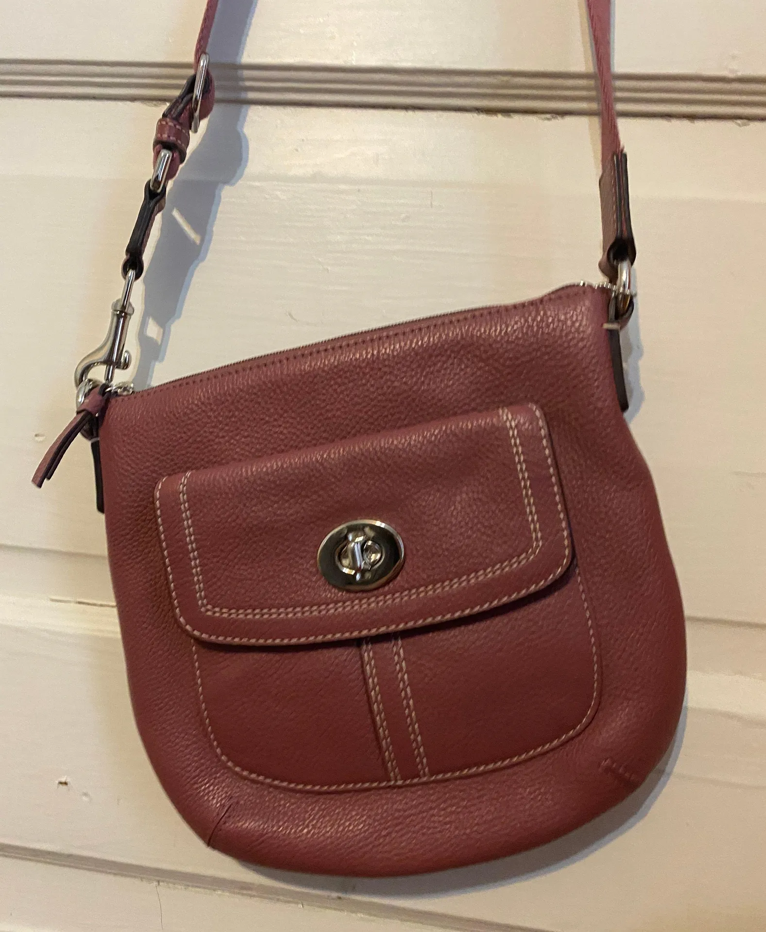 good condition, nice color, inside pocket shown and small outside pocket, adjustable strap