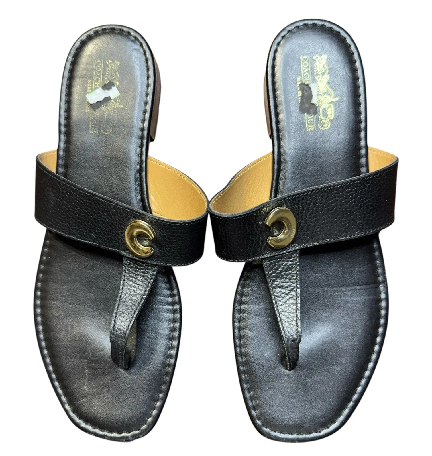 Brand: Coach and Four Style: Womens thong sandals with low block heel and easy slip-on design. Color: Black with tan leather lining and gold-tone C logo hardware on the strap. Size: Womens US 7.5 (marked 7 1/2 on sole). Materials: Leather upper and insole with stacked-look block heel and leather sole; made in Italy. Details: Wide textured leather instep strap, toe post thong front, square open toe, contrast stitching, and Coach carriage logo print on the insole.