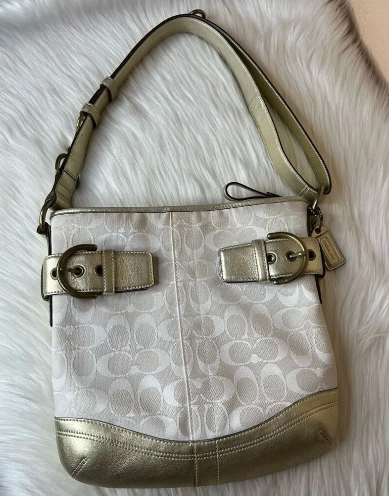 Coach Signature hobo shoulder bag. Cream/Off-White w/Gold leather trim/accents. A couple tiny marks.... Show more