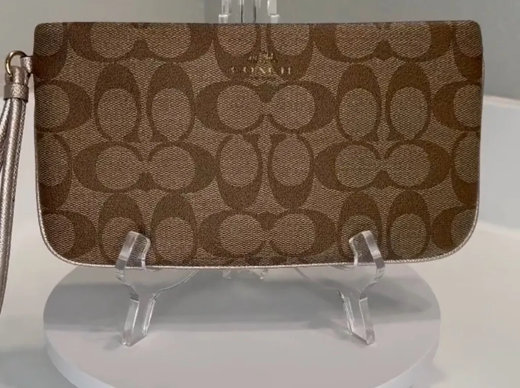 Elegant wristlet with iconic Coach pattern. Ideal for versatile use. Coach clutch/wristlet Khaki & b... Show more