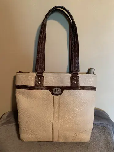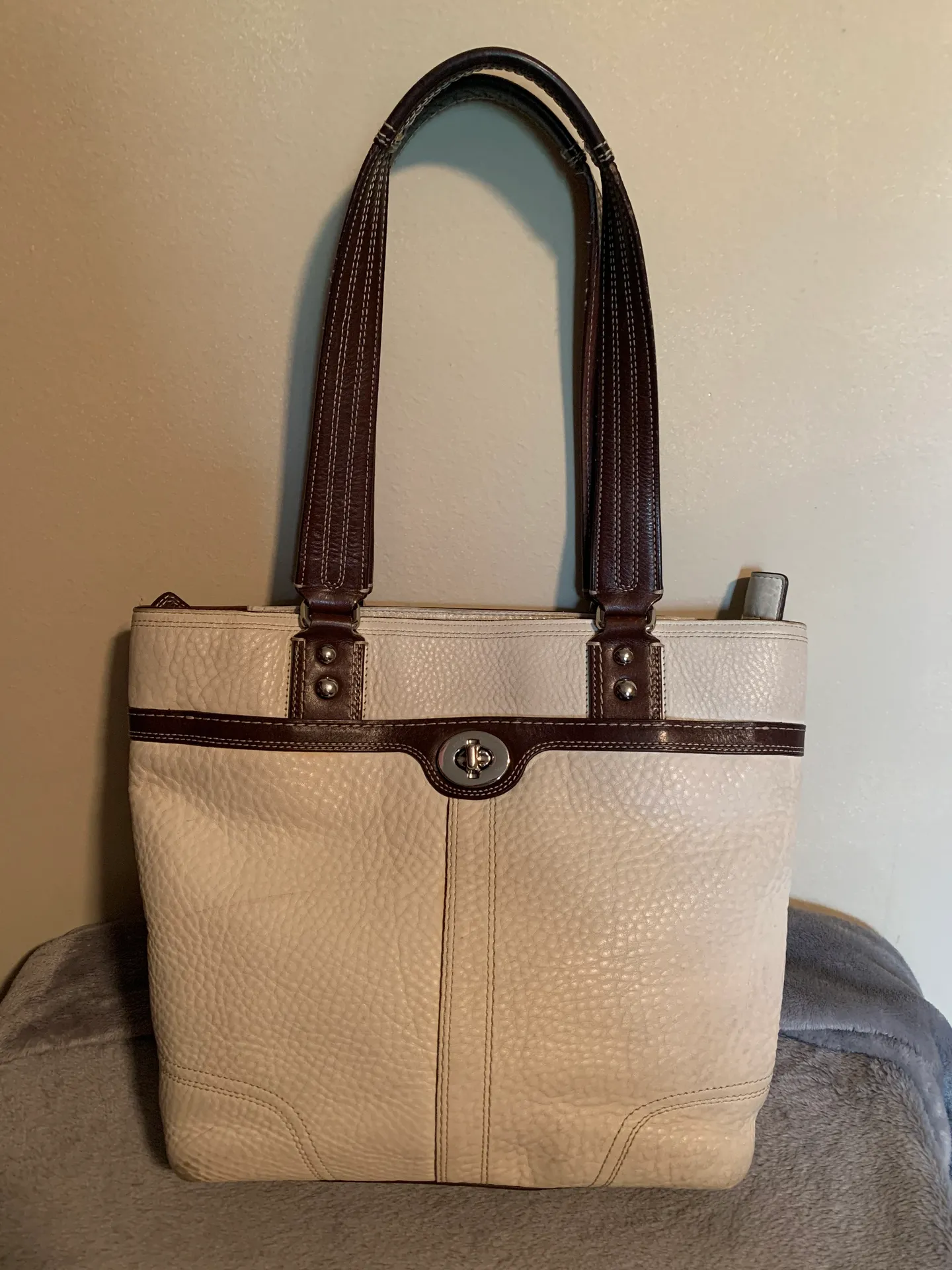 Off-white and brown Coach Purse. Some wear on bottom, still many uses left in it! Clean inside and h... Show more