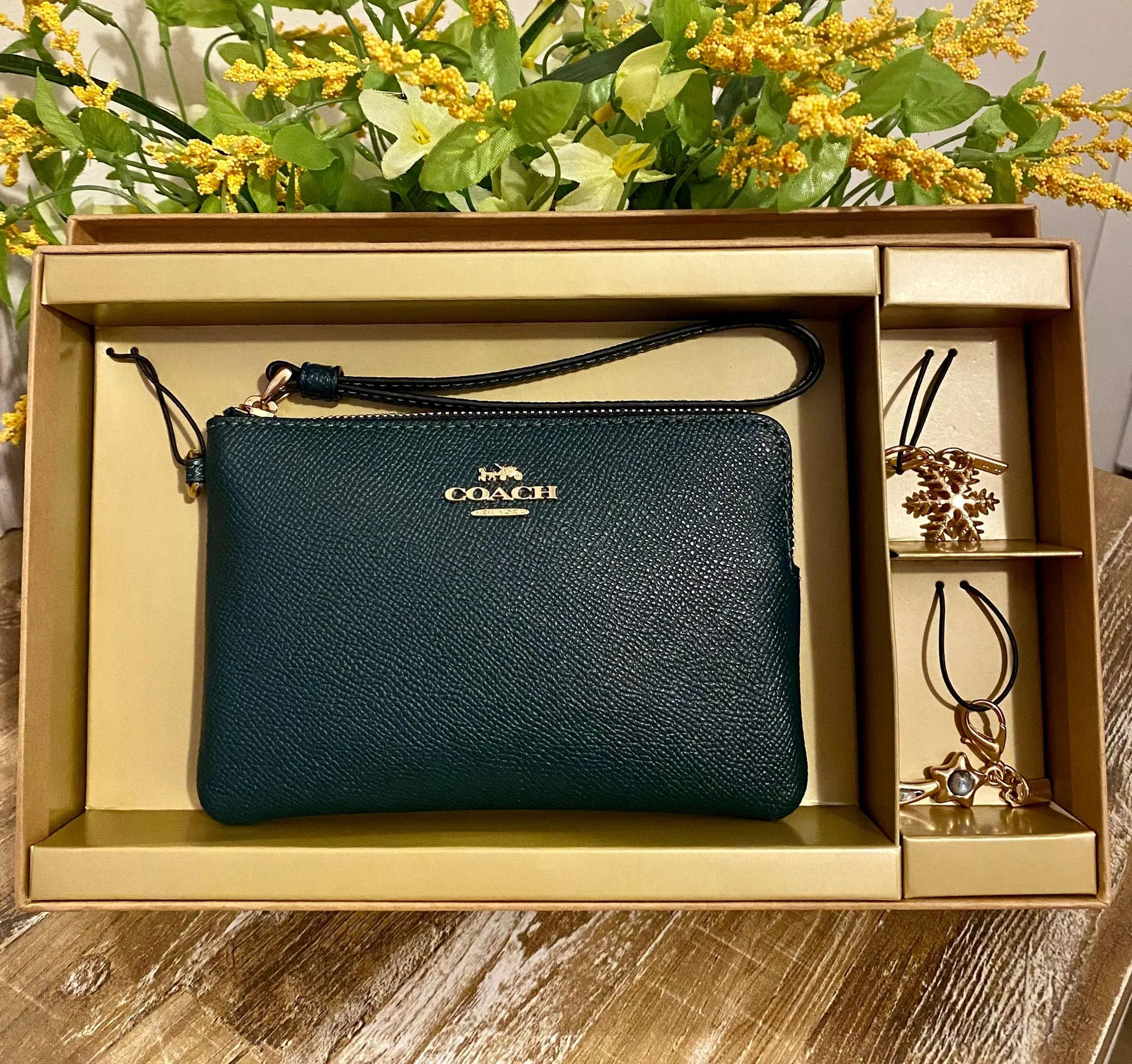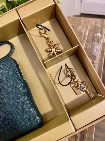 Brand new with box! Two charms and crossgrain leather corner zip wallet in forest green and gold-ton... Show more