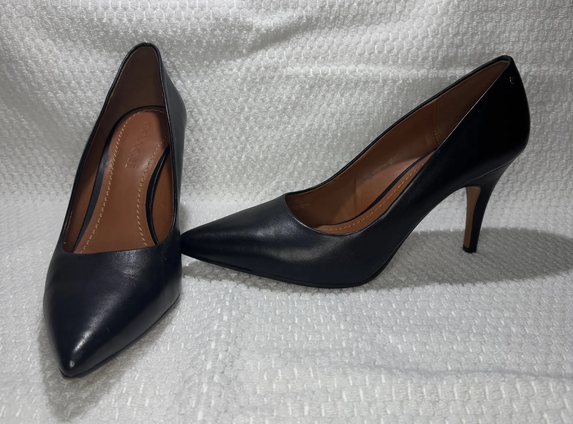 This is a beautiful, classic pair of COACH Waverly Pumps in black leather, perfect for the office, f... Show more