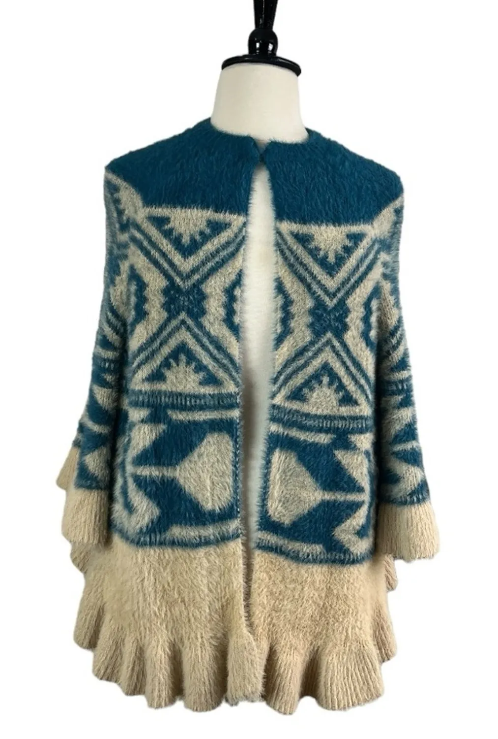 Cobble Lane NEW Women’s Long Cardigan Sweater Ruffle Sleeve Hem Fuzzy Size XL Style Details • Open front long sweater • Closure at neckline • 3/4 wide ruffle sleeves • Ruffle hi low hem • Super soft & fuzzy • Dark teal & cream • Abstract pattern • Nylon & acrylic, hand wash • New with tags NWT Fit Details • Size XL - stretches a little • 20” across underarms • 31” length from shoulder to hem • 26” sleeve length • Measurements taken across laying flat Fall winter soft fuzzy cozy warm ski plus curvy business casual colorful bright classic modest apres Scandi Indie artsy layering relaxed freespirit trendy cabin folk bold tribal preppy cabincore cottage cottagecore boho bohemian