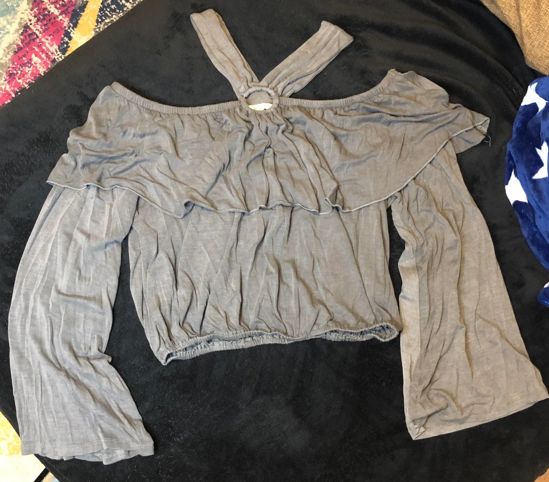 Adorable off the shoulder grey crop. Sinched top and bottom so it’s loose not tight. Bell sleeves keep it nice and flowy. Single ruffle at the top. Straps help to keep it up so you’re not adjusting it all day. Super soft material. Can fit small/ medium depending if you want it looser or tighter. Only worn a few times. Color is the distressed grey color from time of purchase! I can provide more picture’s if you’re interested, just send me a message :)