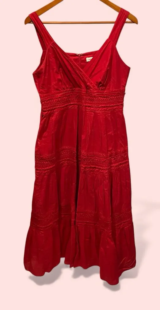 Cute distressed cotton ruffle lady in red faux wrap front tiered maxi dress. Needs a washing for some light spots (shown in photo). Brand is Coldwater Creek. Braided accents. Size 12. Back zipper closure. Measurements taken laying flat are approximately: Pit to pit: 19” Waist: 17” Hip: 25” Length: 50.5”