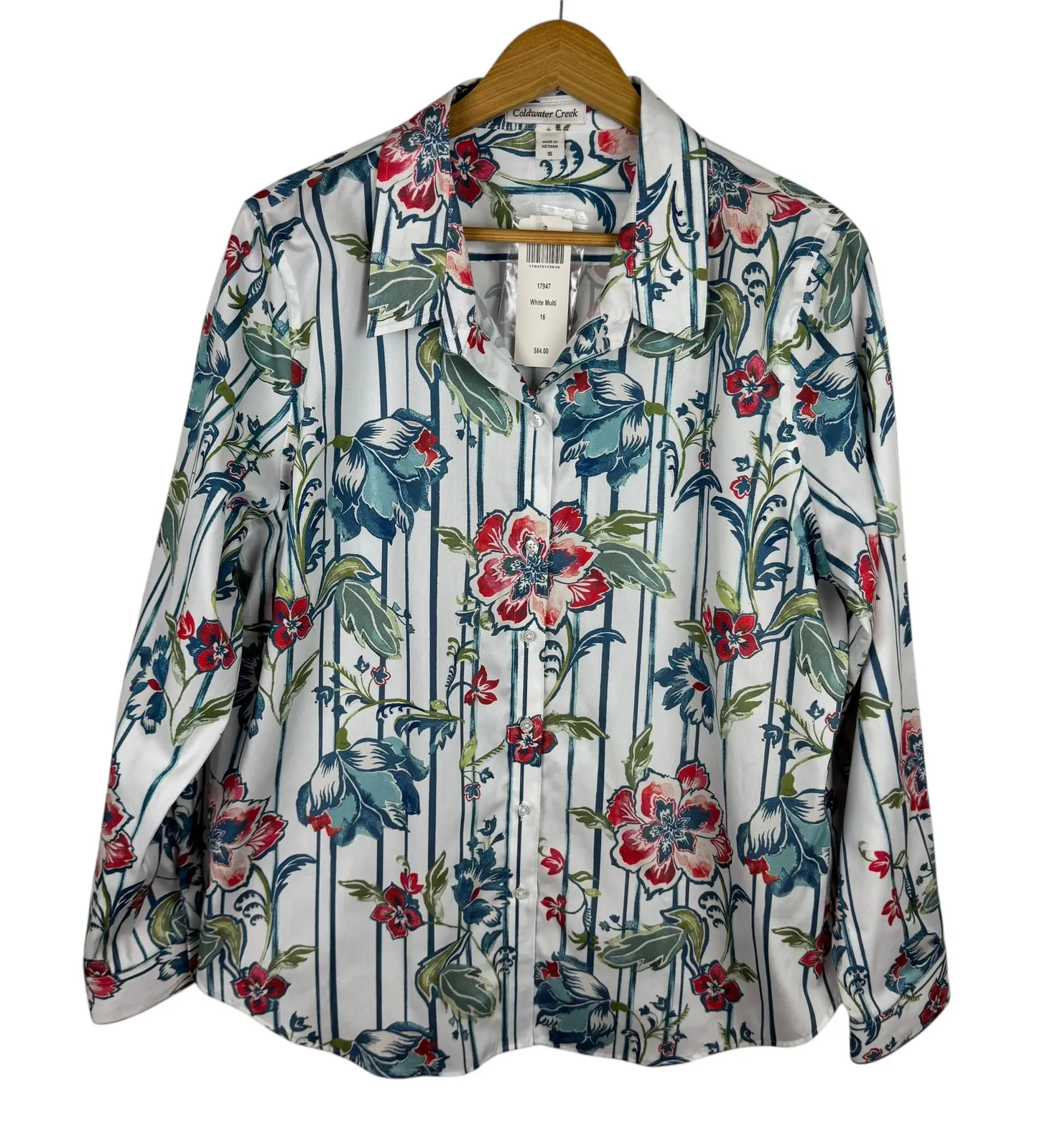 A stylish and vibrant Coldwater Creek button-down shirt, perfect for adding a pop of color to your wardrobe. This long-sleeve shirt features a beautiful floral pattern in red, blue, and green hues, set against a backdrop of white with subtle blue stripes. The classic button-down design offers versatility, making it suitable for both casual and semi-formal occasions. This shirt is ideal for a relaxed weekend brunch, a casual office setting, or a garden party. Color: Multicolor Type: Blouse Department: Women Style: Basic Material: Cotton Neckline: Collared Sleeve Length: Long Sleeve Sleeve Type: Classic/Fitted Sleeve Pattern: Floral Accents: Button Features: Collared, Lightweight, Breathable, All Seasons Fit: Regular Keywords: Coldwater Creek, floral shirt, button down shirt, long sleeve shirt, striped shirt, white shirt, multi color shirt, womens shirt, size 16, cotton shirt, casual shirt, blouse, floral blouse, spring shirt, summer shirt Brand new with tags (see pics for details) Flaws: No visible flaws. Measurements: included in photos. Please compare the measurements to something you already own for a great fit! Fast shipping: Shipped out next business day! Please let us know if you have any questions!