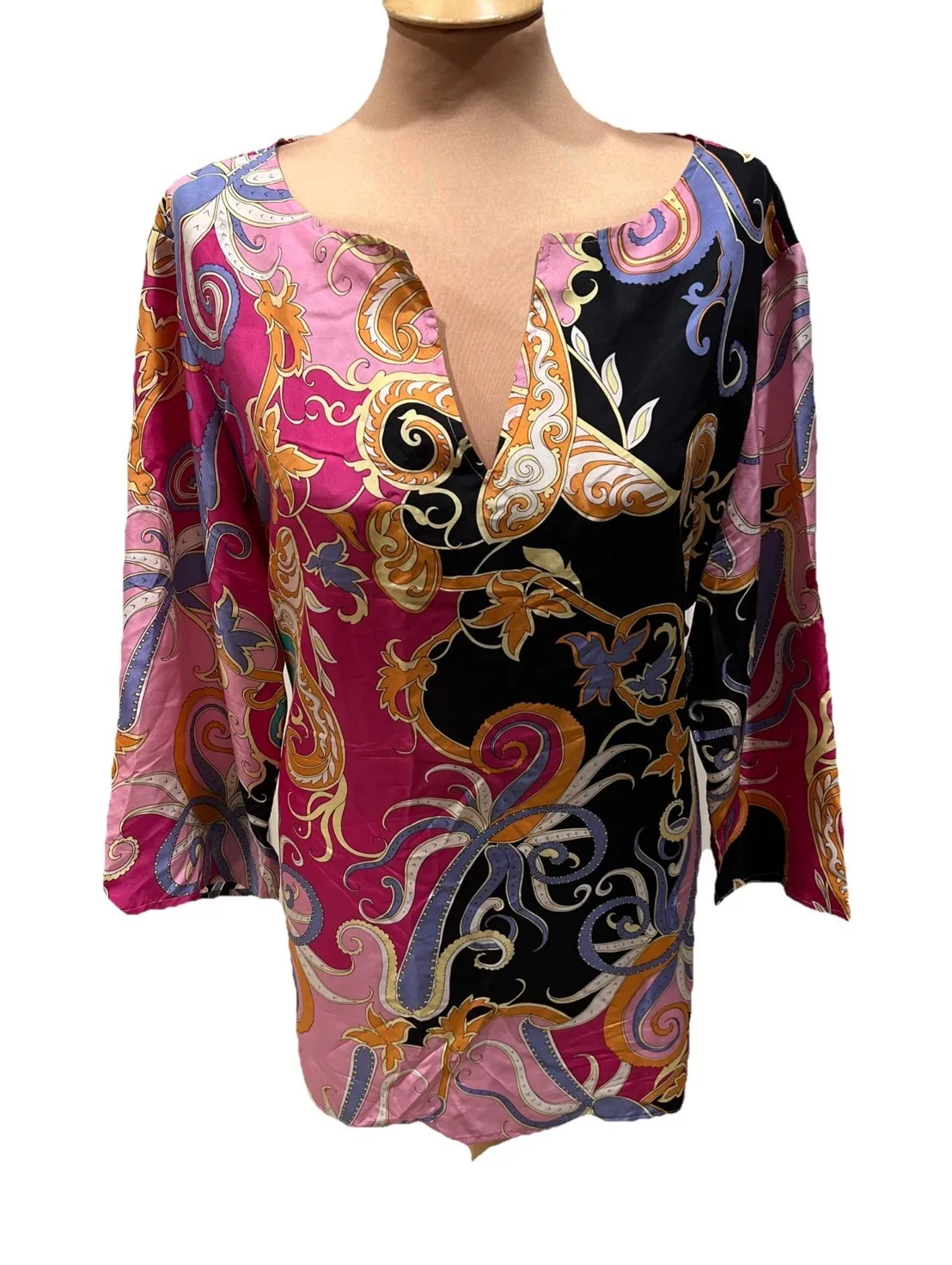 Good pre-owned condition with no stains or holes noted. There is some slight discoloration on the size tag. Please see all photos for more detail. Measurements: Chest - 25" from armpit to armpit Waist - 23 1/2" across Sleeve length - 19" Length - 28"