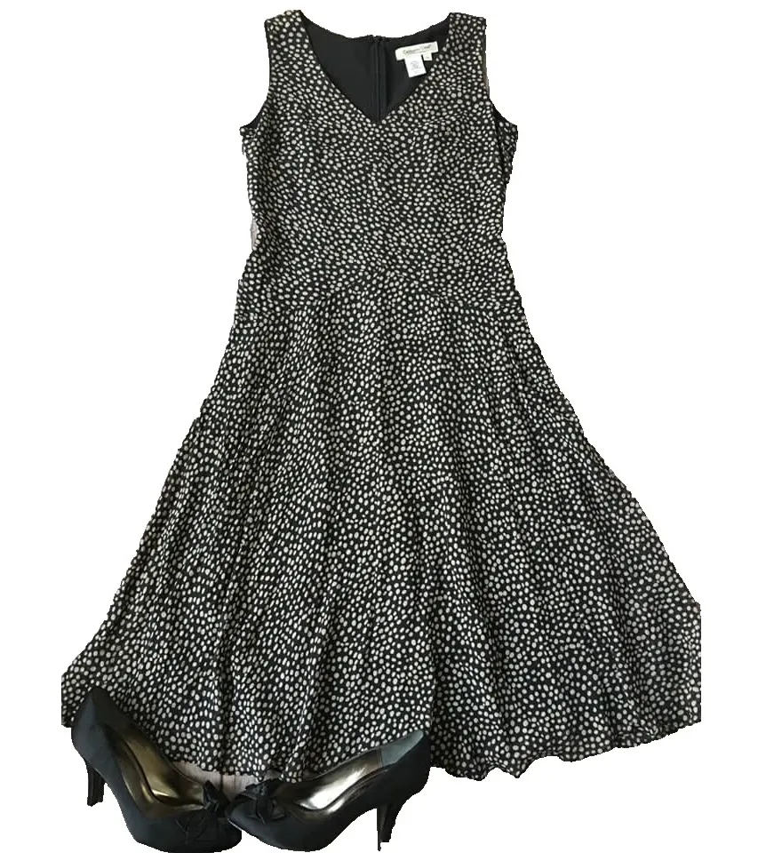 Coldwater Creek Silk Fit Flare Dress Petite Womens 6P PS Polka Dot Print A Line Office Condition: PROPS and ACCESSORIES NOT INCLUDED - pre-owned; no holes, stains or other significant issues noted. Please see all photos as they are part of the description. Brand: Coldwater Creek Petite Women's Size: P6 / PS Color: Black. Off White Print: Polka Dot / Geometric V Neckline Back Zipper Fully Lined Slightly Drop Waist Dry Clean Made in China 100% Silk Dress with 100% Polyester Lining Style Profile: Classic, Preppy, Chic, Traditional, Monochromatic Fit/Measurement Guide: 36" doubled - underarm to underarm 29" doubled - waist 42" doubled - hip 43" dress length - top of shoulder to bottom hem (As all clothing will fit differently from person to person, please compare measurements given in this listing to a good fitting clothing item you currently wear for best comparison). All accessories & props are not included, unless otherwise specified. 9 oz