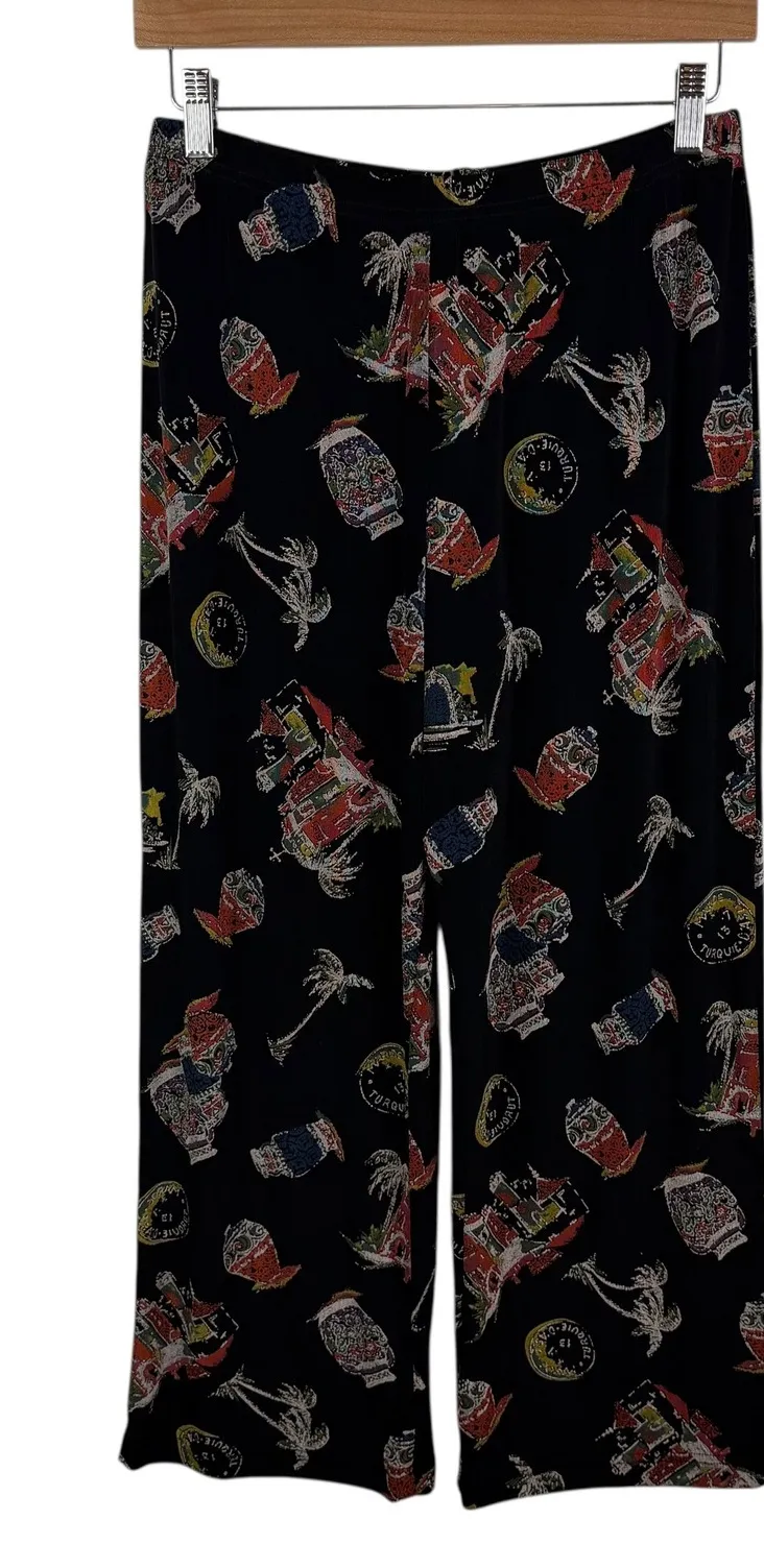 Coldwater Creek black pants adorned with a vibrant tropical print featuring palm trees, cocktails, a... Show more