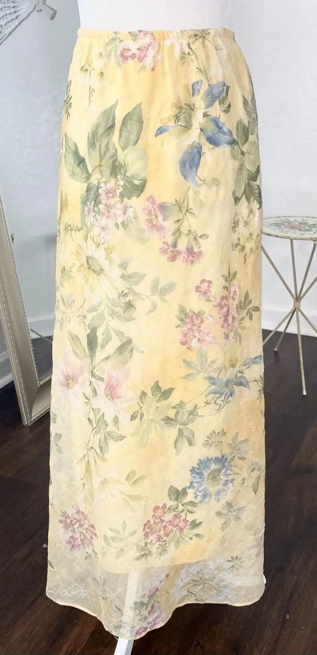 🥀 Boho Cottage Core Butter Yellow Maxi Skirt 🥀 ༓ Brand: Coldwater Creek, Made in USA ༓ Size: 16 / XL ༓ stunning light yellow mesh maxi skirt with intricate romantic floral flower design ༓ stretchy waist ༓ so stunning, whimsical romantic fairycore / cottagecore Measurements: ༓ single waist from 15" to 24" fully stretched ༓ length: 36.5" Tags: #boho #cottagecore #fairycore #whimsical #fairy