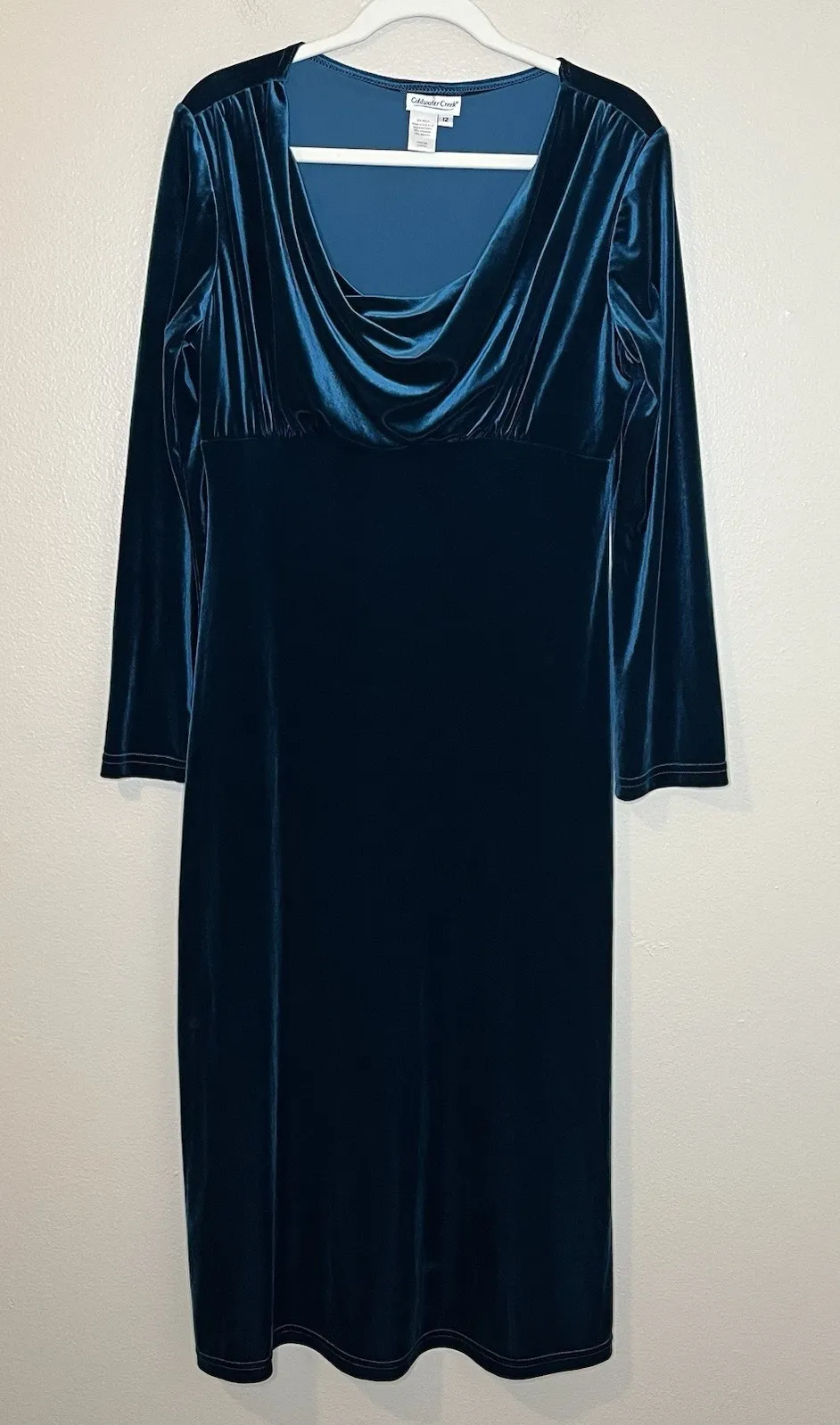 A beautiful vintage dress by cold water creek -dark teal color -velvet -stretchy -cowl neck -long sleeve -midi -baby doll/ empire waist In excellent used condition, gently used no flawed found Women's size 12 Measurements are approximate & taken while item was laid flat: Chest: 19.5" Empire Waist: Hips:17.5" Length: 49.5" Length of sleeve from shoulder to cuff: 24" Please let me know if you have any questions!
