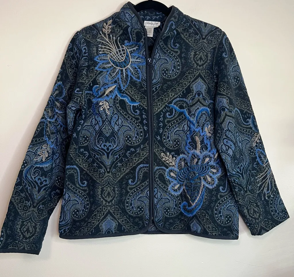 Beautiful Coldwater Creek zip-up jacket featuring an intricate blue paisley and floral woven pattern with detailed embroidery. Made in India with a cotton/polyester blend and rayon embroidery, this piece has a rich tapestry texture and is perfect for layering in cooler weather. Mandarin-style collar, front pockets, and full zip closure. Size small with a relaxed, comfortable fit.