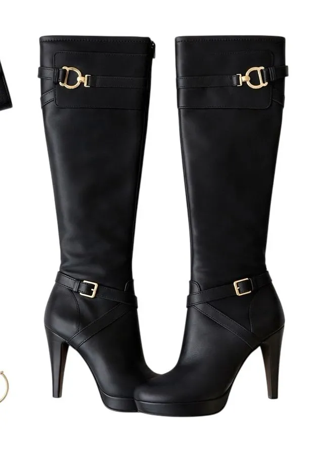 Cole Haan Air Julisa tall knee-high boots crafted from soft black leather with equestrian-inspired g... Show more